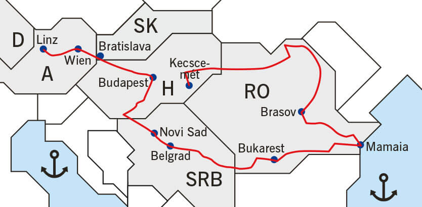 Begrüßungsessen in Linz, Brotzeit beim Heurigen in Wien, Stadtrundfahrt Wien, Stadtrundfahrt Belgrad, Stadtrundfahrt Bukarest, Schiffsausflug Donaudelta mit Mittagessen, Drei Busausflüge „Schloss Peles”, Prejmer und „Palinkabrennerei“, „Dracula, Brasov und Umgebung“ und „Moldauklöster“ zwei davon mit Mittagessen, Folkloreabend mit Essen, Reitervorführung, Kesselgulasch, Wein und Barack Palinka zum Abschied, vier weitere Essen